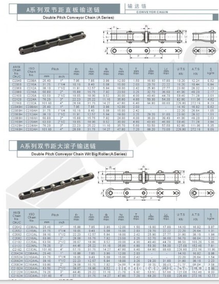 雙節(jié)距加長銷軸鏈條,是直板的輸送鏈條,最小的節(jié)距是25.4毫米,一直到101.6毫米都是可以定做的,節(jié)距不同,對應的參數(shù)是不同的,我們可以舉例說明,C2042型的加長銷鏈條,節(jié)距是25.4毫米,滾子直徑是15.88毫米,內(nèi)節(jié)內(nèi)寬是7.85毫米,銷軸直徑是3.96毫米,銷軸長度是16.6毫米,內(nèi)鏈板高度是12毫米,鏈板厚度是1.5毫米。不同型號,對應不同的參數(shù),型號有C2052,C2062,C2082,C2122,C2102等,我們生產(chǎn)質(zhì)量上乘的鏈條,買的放心,用著更放心。