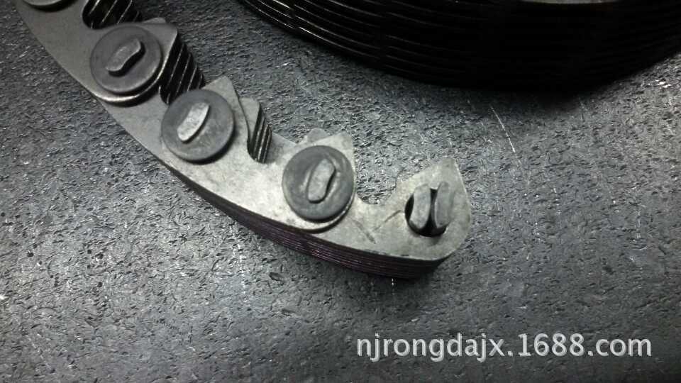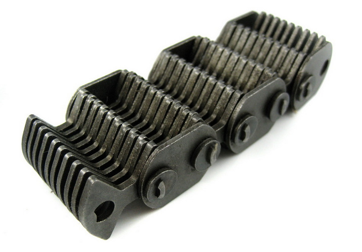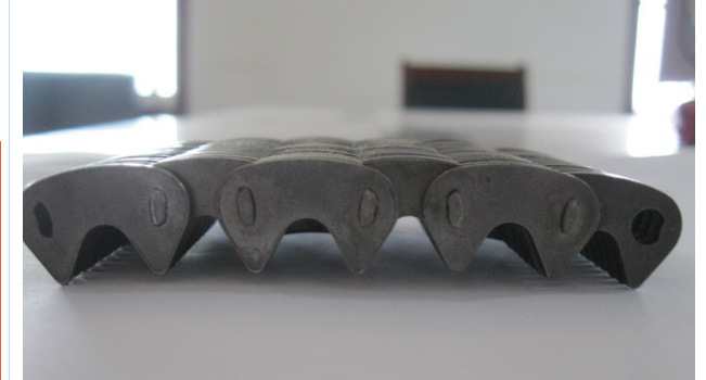 HV416-96l哈瓦鏈條:一種雙軸的齒形鏈條,軸是兩根用,在一個(gè)鏈條孔里面有兩個(gè)瓦片銷軸。下圖是HV416齒形鏈條。有5個(gè)導(dǎo)向片,60個(gè)帶尖的齒形鏈片,長(zhǎng)度106.5毫米,2500元一條。