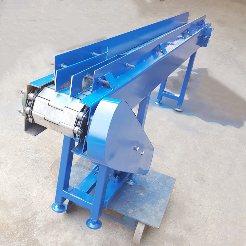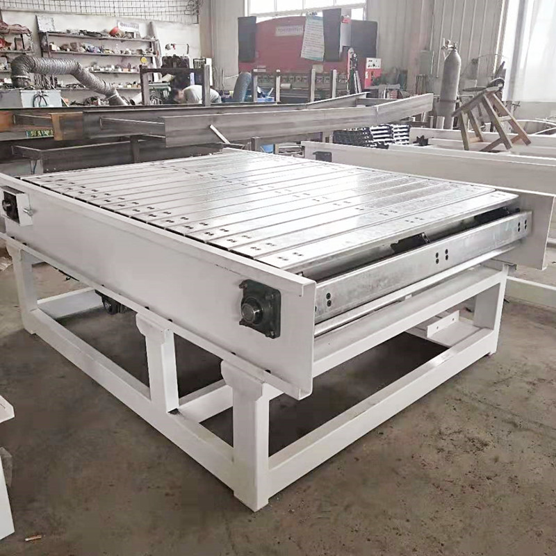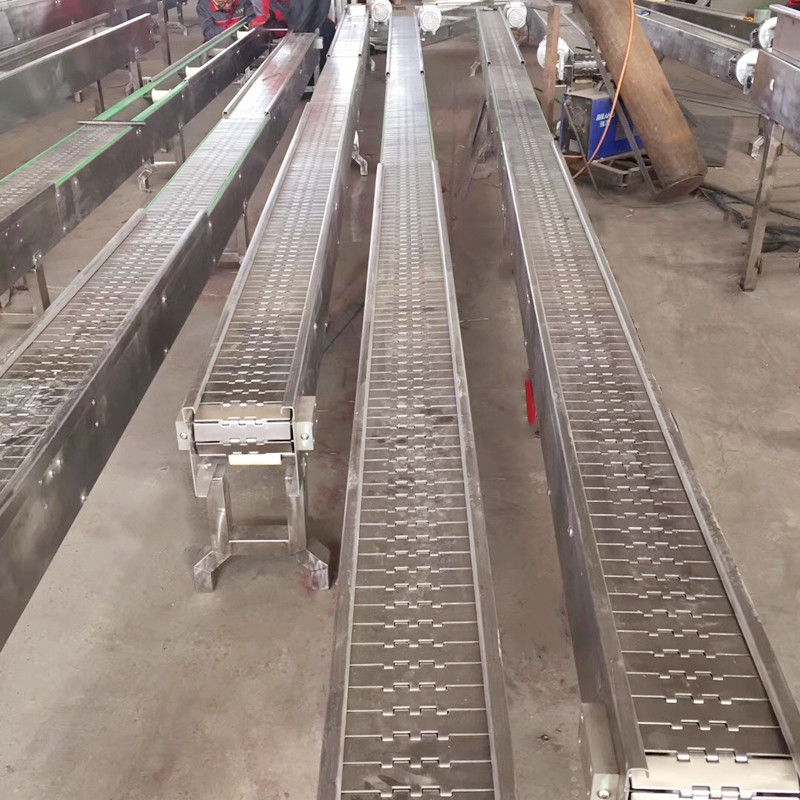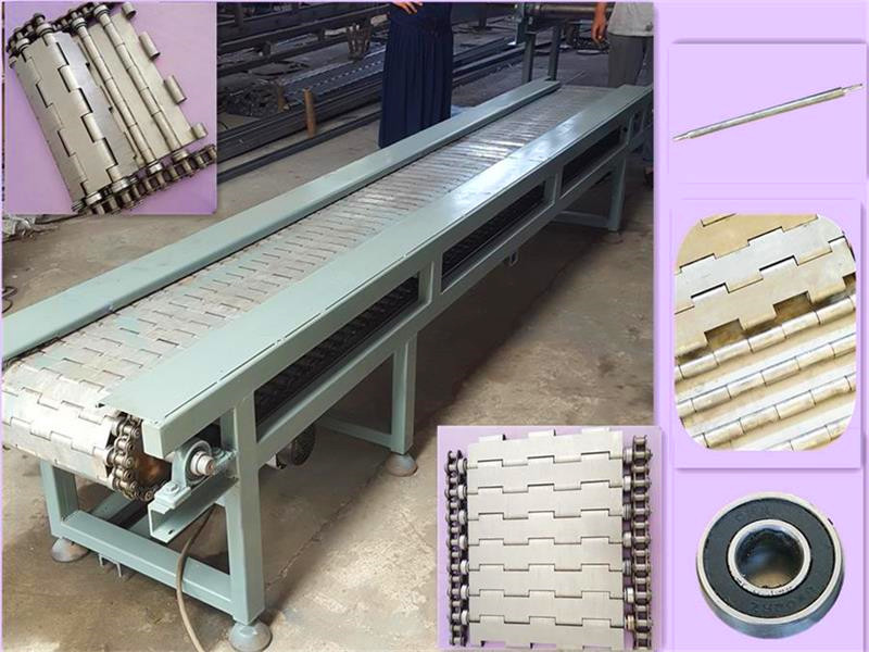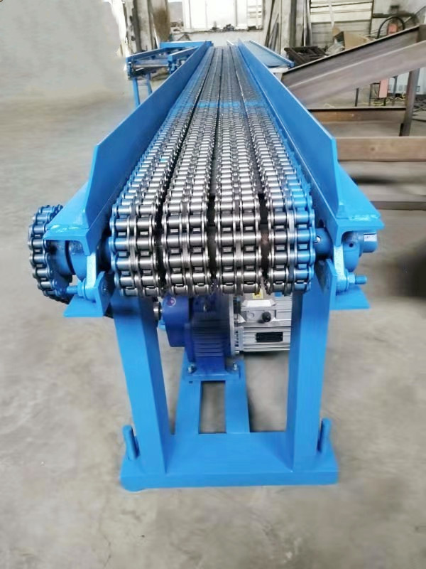 (1)精密滾子鏈條輸送機,采用多排的精密滾子鏈條,抗砸,抗沖擊力,快速,傳送速度快,適合大件,高速的熱鍛造件傳送。鏈條的下面是加厚加重的底板,使用起來放心安心。
