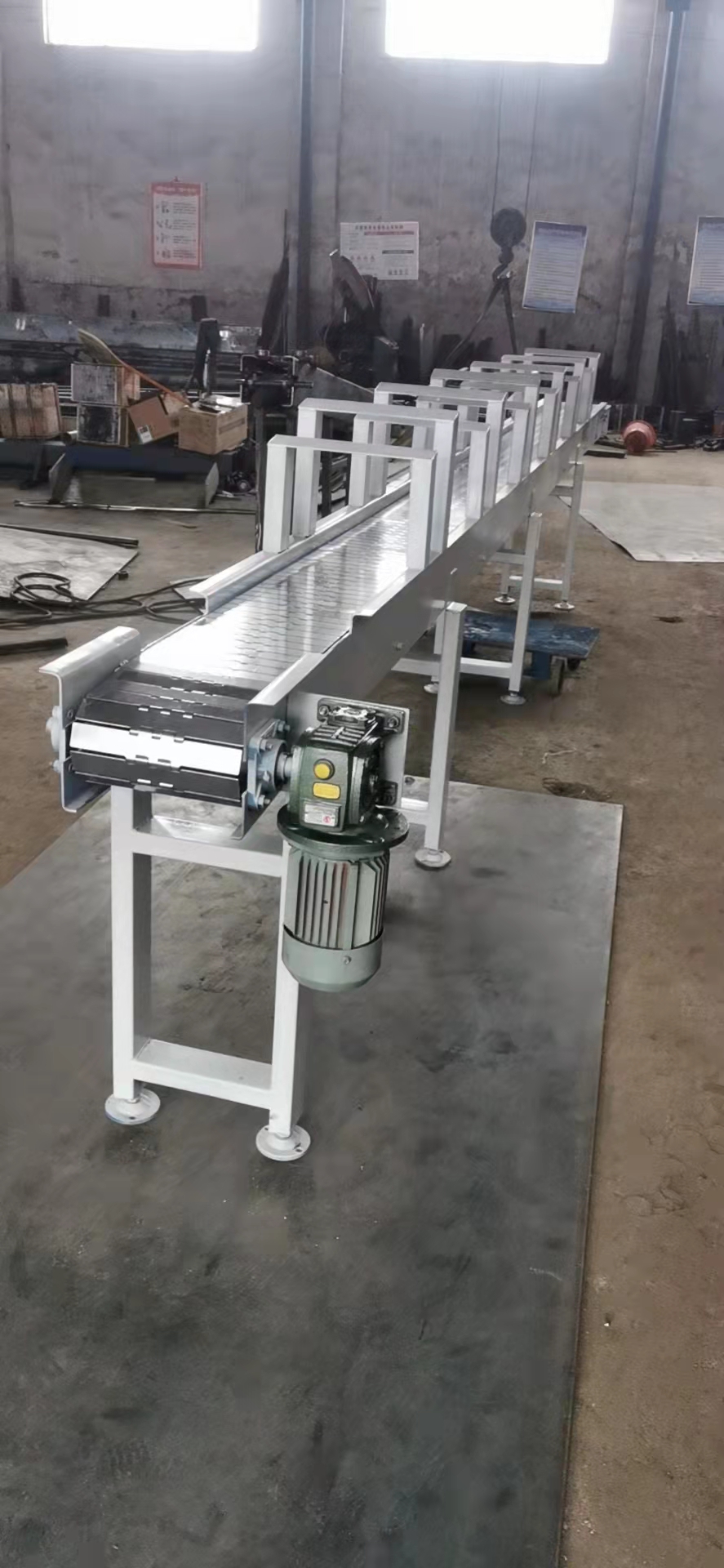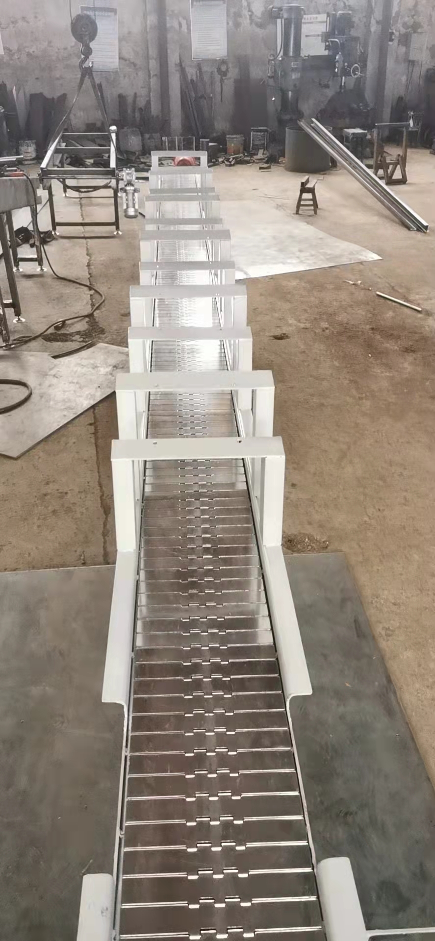 鍛造件鏈板輸送機(jī)是直接輸送高溫鍛造件的,其輸送帶必須能不怕熱,不變形,還耐高溫很強(qiáng)才可以承載鍛造件。我們采用的是耐熱的不銹鋼鏈板輸送帶。根據(jù)寬度不同,有平頂鏈鏈板輸送帶,合頁(yè)鏈板輸送帶和槽鋼鏈板輸送帶。已標(biāo)準(zhǔn)的頂板鏈或合頁(yè)鏈板輸送帶為承載面,以馬達(dá)減速機(jī)做動(dòng)力傳動(dòng)。